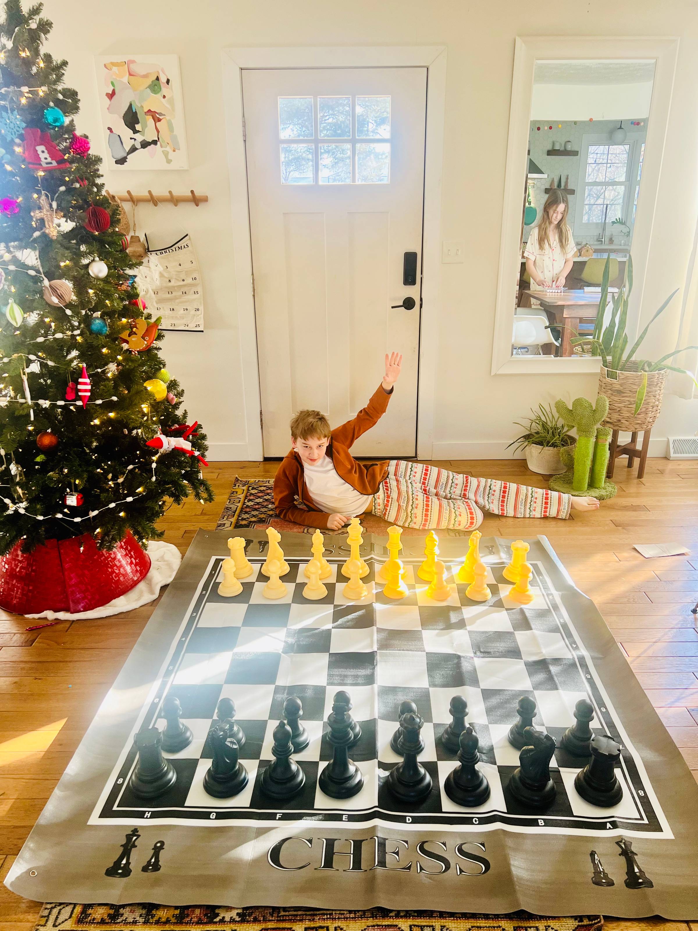 A gigantic chess set for the win. Now we can lose to him in an even bigger way!