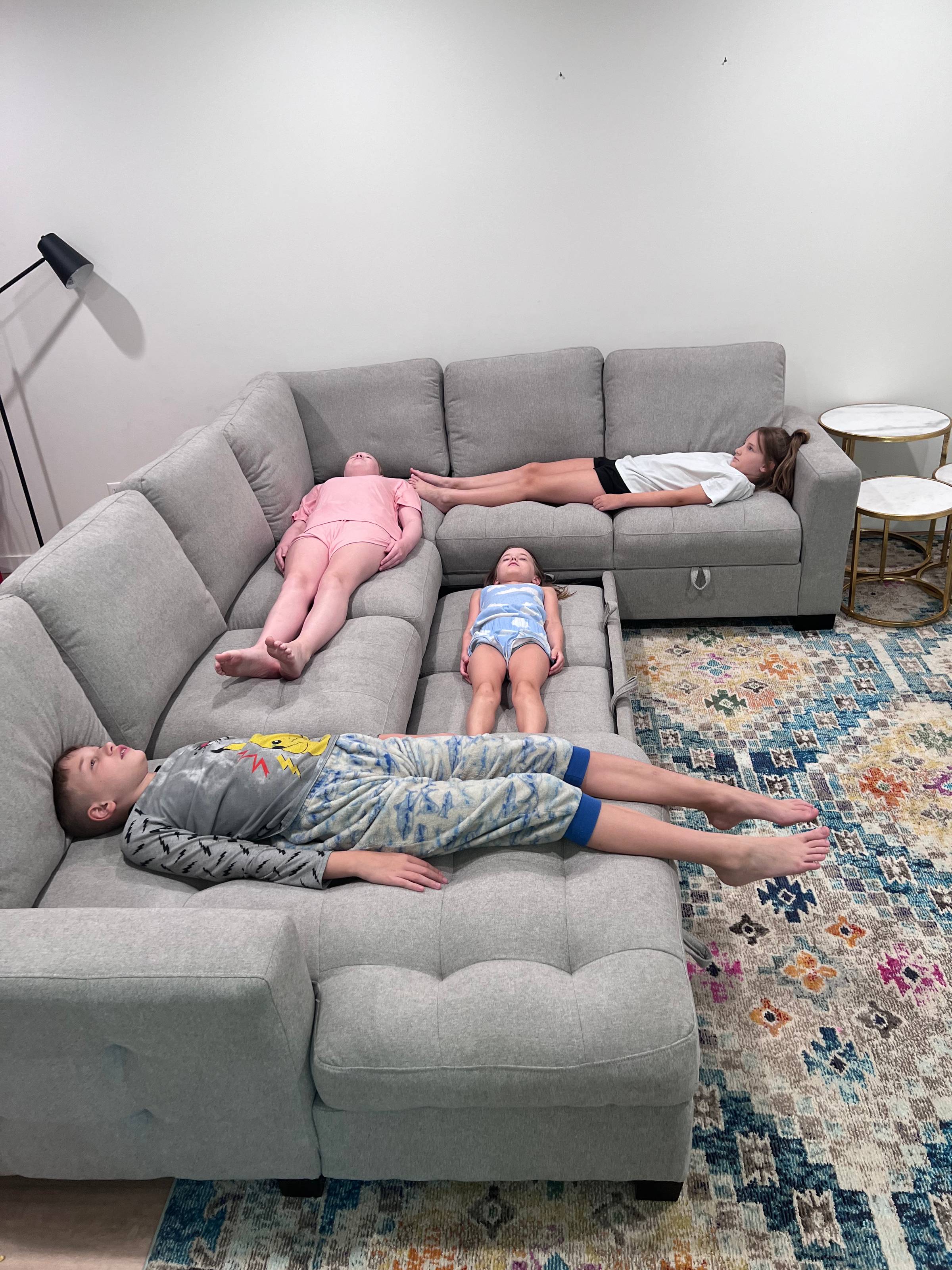 It takes a jumbo-sized couch to fit our jumbo-sized family. (Psst. I'm eyeing you, blank wall. I'm coming for you.)
